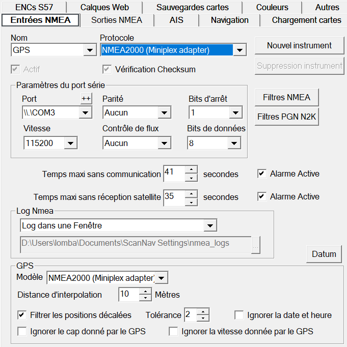 A partir de la version 21.0, il est possible de démarrer l'écoute du GPS et autres Instruments de façon automatique au lancement de ScanNav.
